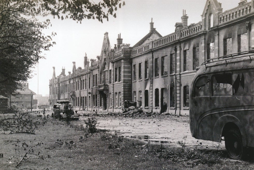 De kapotgeschoten Rabenhauptkazerne aan de Hereweg.