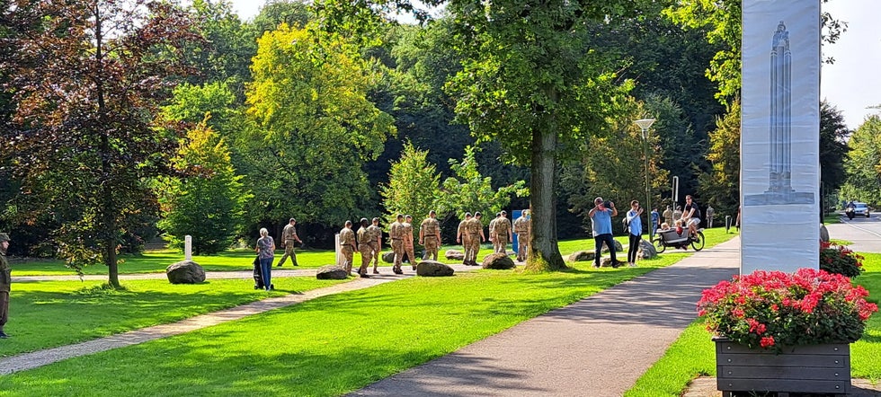 We konden de auto dankzij een vertrekkende automobilste die ons welwillend haar parkeerplek aanbood, dichtbij het Airborne Museum parkeren. We waren nog ruim op tijd dus gingen we eerst kijken naar een kranslegging bij het Airborne Museum bij het monument waarvan helaas het bovenste deel is ontvreemd.