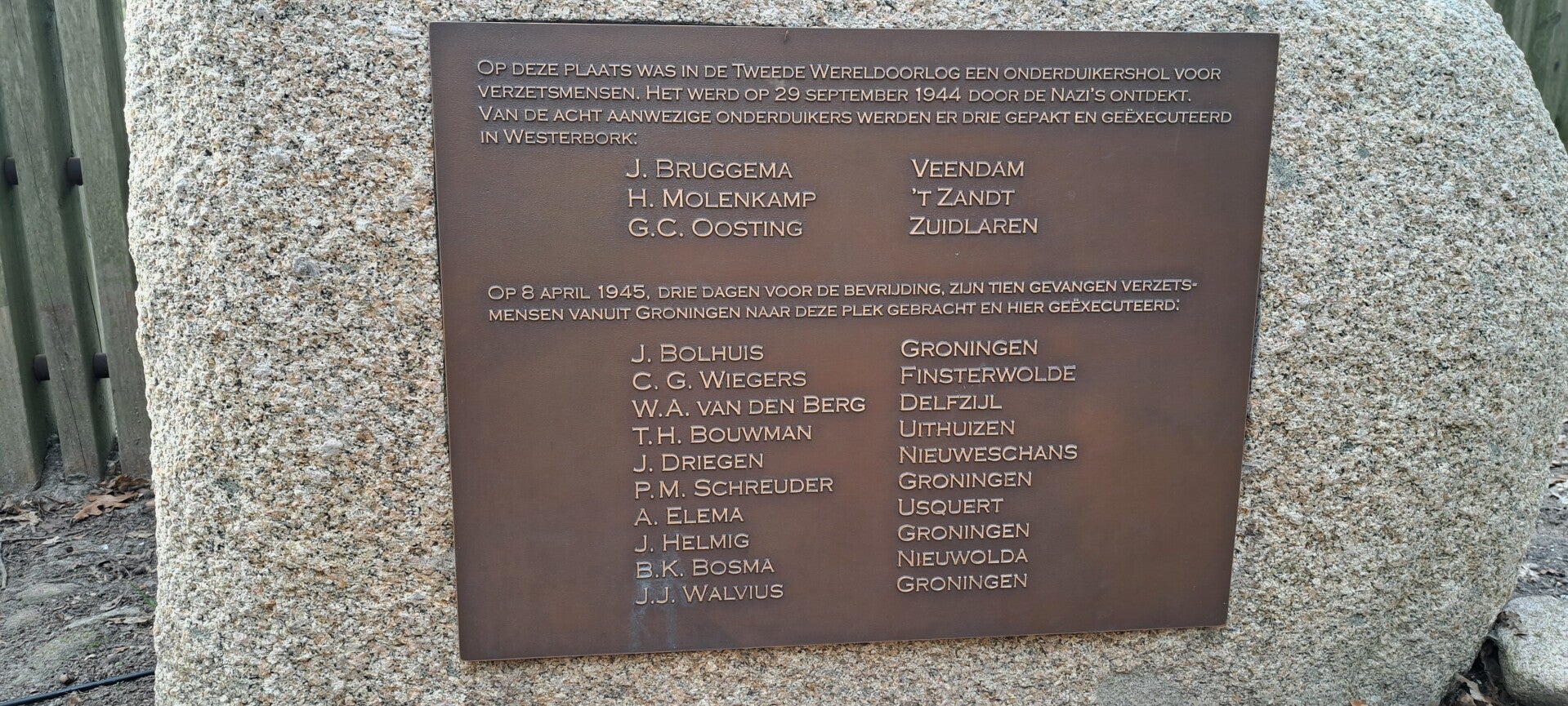 Kort voor de bevrijding werden op deze plaats tien verzetsstrijders uit het Scholtenhuis in Groningen geëxecuteerd. Voor hen werd na de oorlog een gedenkteken opgericht, aanvankelijk alleen voor de tien mensen die hier werden gedood, later ook voor de drie in Westerbork omgebrachte onderduikers. Later kwam er ook nog een herdenkingsplek.