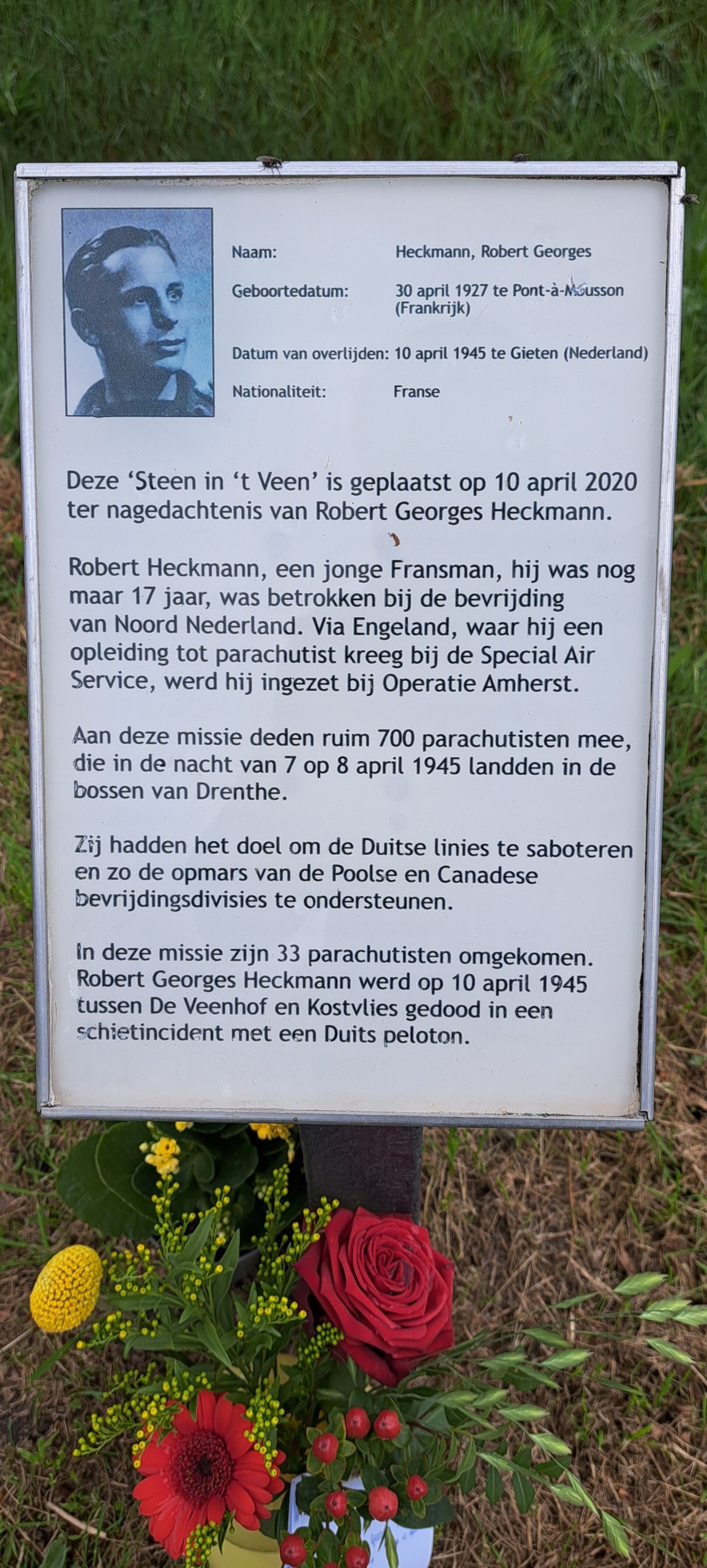 Op vrijdag 12 april 2024 waren we op de Verlengde Grensweg te Gieten bij het monument ter nagedachtenis van Robert Georges Neckmann, een parachutist van de SAS, die tijdens operatie Amherst werd gedropt boven Drenthe en op deze locatie sneuvelde op 10 april 1945, een paar dagen voor de bevrijding. Hij zou op 30 april 1945 18 jaar zijn geworden, dus hij was nog 17. Deze jonge jongen sneuvelde door Duits vuur voor onze vrijheid. Deze herdenking was één in de reeks van herdenkingen bij Amherst-monumenten, georganiseerd door de Stichting Herdenking Franse Parachutisten.