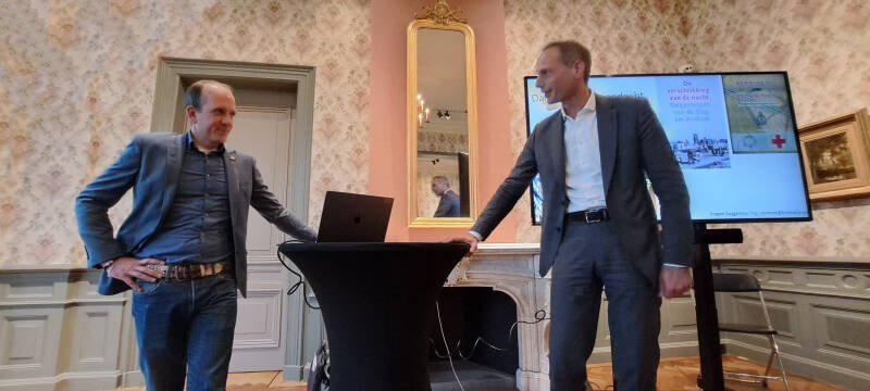 De lezing door Matthijs Somford (links) wordt geïntroduceerd door de museumdirecteur Ronnie Weijers (rechts). Matthijs Somford is orthopedisch chirurg en kenner op het gebied van medische zorg tijdens de slag om Arnhem. We hebben geboeid naar hem geluisterd. Dr. Somford deelde persoonlijke verhalen over hoe burgers hun werkzaamheden uitvoerden onder vaak gevaarlijke omstandigheden en de risico's die ze daarbij liepen. Deze burgers waren zowel verplegenden als burgers die zich ontfermden over de gewonden tijdens de slag. Denk hierbij niet in het minst aan de 'engel van Arnhem' Kate ter Horst. Op 17 september 1944 krijgt Kate ter Horst het verzoek van Britse militairen om hun huis open te stellen als eerstehulppost. Spoedig ligt het huis vol gewonden en Kate doet wat ze kan om te helpen...