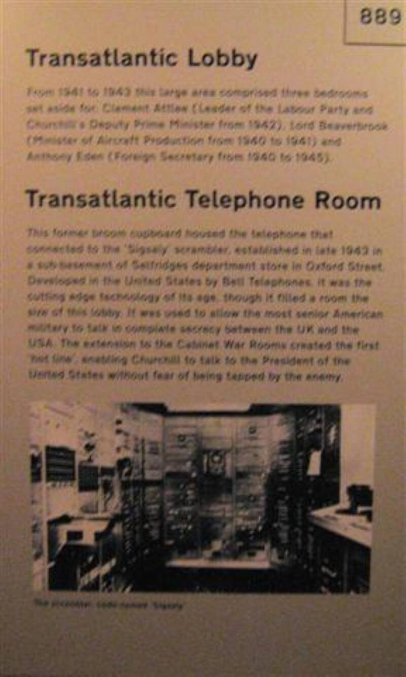 The centrepiece of the War Rooms is the Cabinet Room itself, where Churchill's War Cabinet met. The Map Room is located nearby, from where the course of the war was directed. It is still in much the same condition as when it was abandoned, with the original maps still on the walls and telephones lining the desks. Churchill slept in a small nearby bedroom although, according to the audio presentation in the museum, he only slept in the war rooms for three nights over the course of the war. One feature of the bunker was a het gecodeerd kunnen telefoneren, dat Churchill in staat stelde geheime besprekingen met president Roosevelt in het Witte Huis te voeren. De ruimte was verborgen als het toilet van de premier.