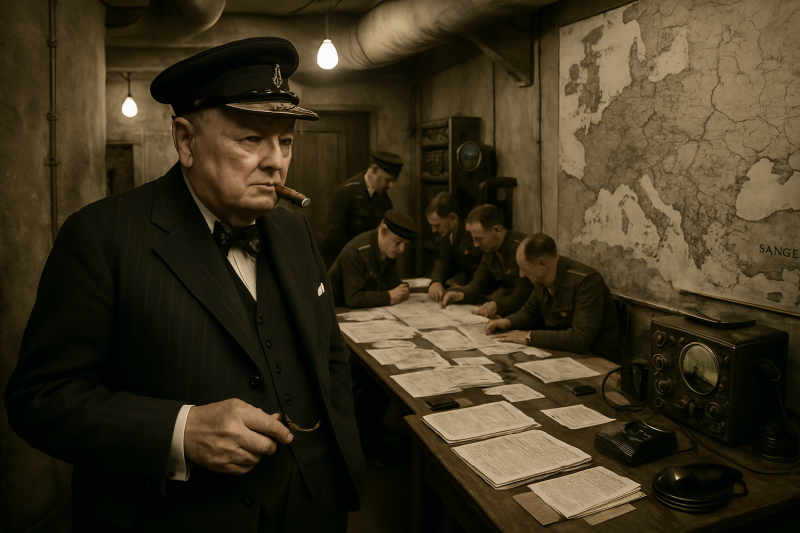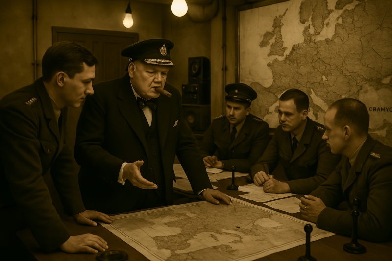 Met behulp van AI heb ik beelden vervaardigd van Churchill in zijn War Rooms tijdens de spannende jaren van de Tweede Wereldoorlog. Terwijl leden van zijn staf druk doende zijn de rapporten van de krijgsverrichtingen te bestuderen, lijkt Churchill diep na te denken over de situatie aan het front, daarbij starend naar de stafkaart.