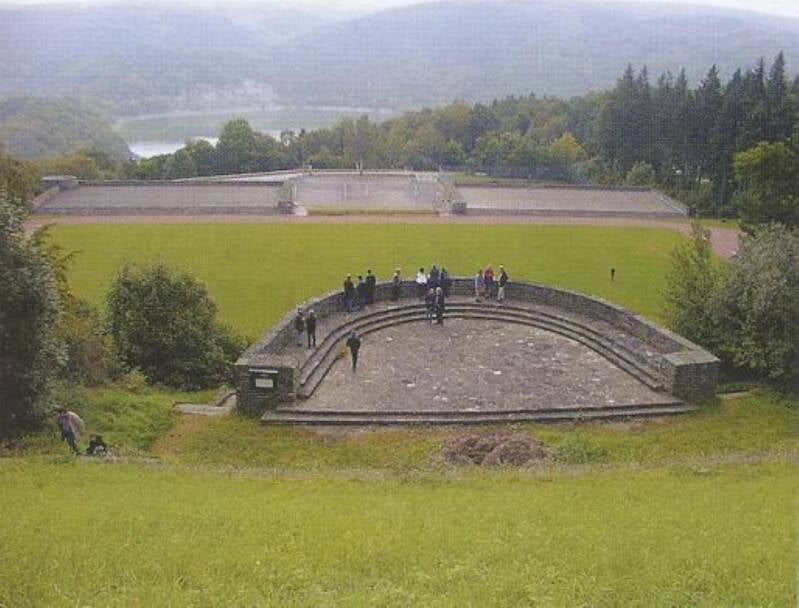 Ook het bordes van Vogelsang is nog vrijwel onveranderd. Boven zoals het was in de nazitijd. Onder is het bordes met op de achtergrond een gallerij nog steeds aanwezig. Zelfs de adelaar is nog duidelijk te zien op de vergelijkingsfoto die ik maakte.