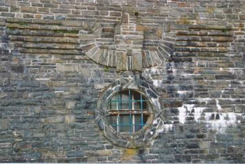 Hier is nog de vorm van de adelaar in de muur te zien. Waar het raam zit zal wel het hakenkruis hebben gezeten.