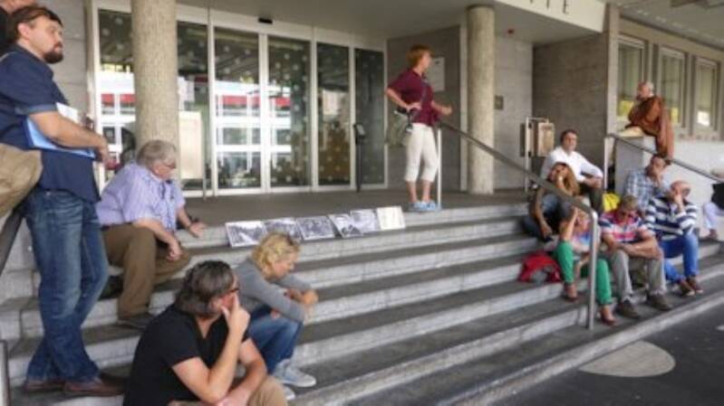 Hier luisteren we op de trappen van het Paleis van Justitie aan het Walburgplein naar het verhaal van ons gids over Horst Weber en Hans-Georg Eberle.