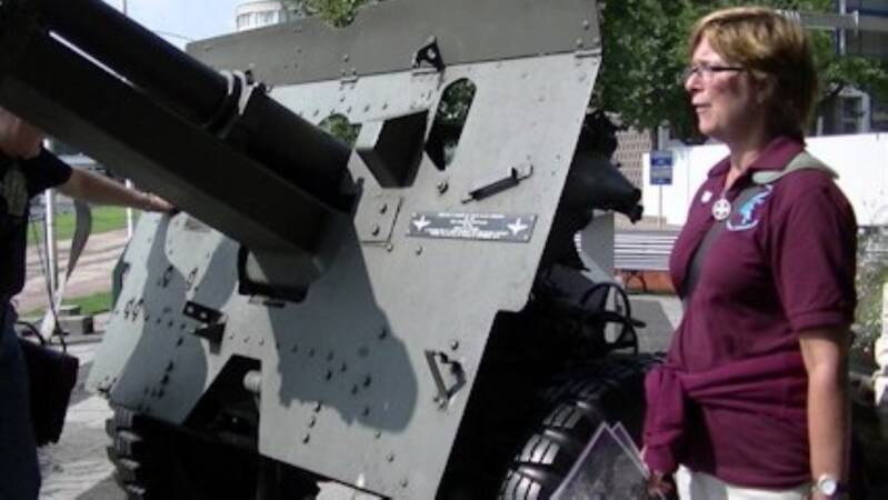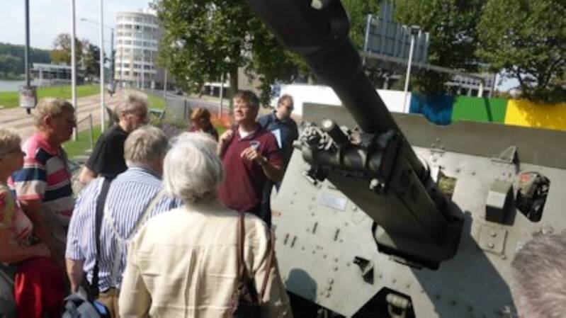 Onze gids Ingrid Maan bij het stuk geschut dat staat opgesteld bij de John Frostbrug in Arnhem