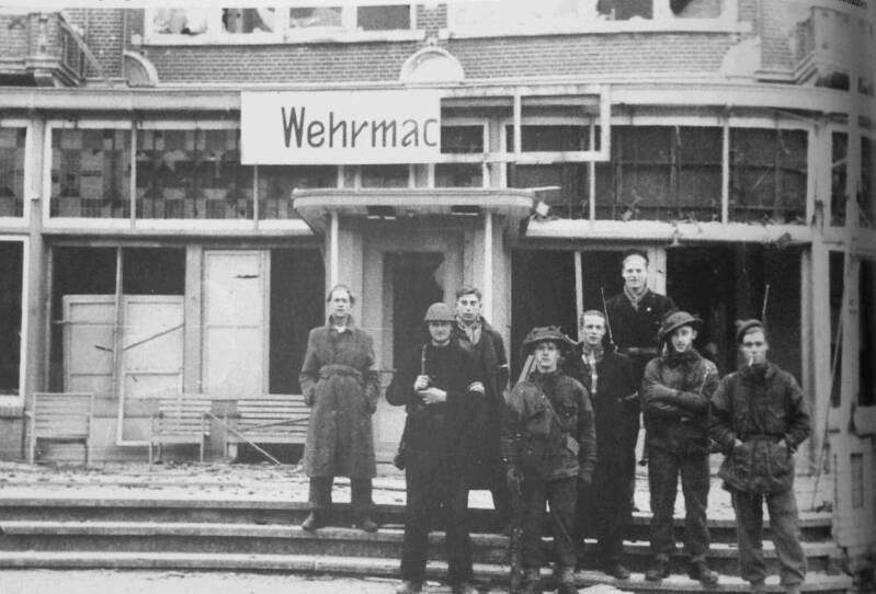 Na de strijd in Vlissingen poseren de overwinnaars, samen met Nederlandse mannen uit het verzet voor het voormalige Wehrmachtheim in Vlissingen.