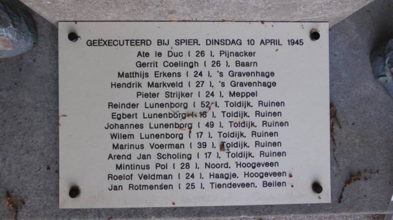 We reden met de bus vanaf het station Meppel naar Spier. Een kruis waarop staat '21 strijders gefusilleerd 10 april 1945'. Voorheen stond het altijd onopvallend tussen de bomen langs de snelweg A28, maar nu is er een gedenkplek van gemaakt. Het gedenkteken werd in 2015 gerenoveerd terwijl ook de omgeving werd aangepast. De geëxecuteerden worden herdacht op het nieuwe gedenkteken bij de plaats waar ze stierven. De exacte plaats was tussen de beide wegdelen van de A28 en daardoor niet meer te bereiken.