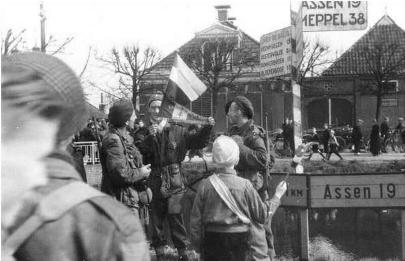Vreugde over de overwinning bij de Stokersverlaatbrug in Appelscha. Bewoners van Appelscha samen met de Franse parachutisten.