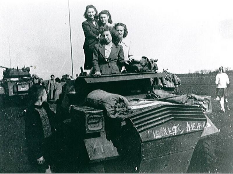 Een Canadese verkenningswagen met opgeluchte vrouwen bij Appelscha op 13 april 1945.