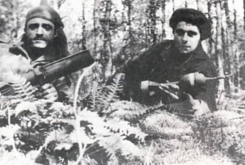 Op patrouille in het staatsbos. Vooraan v.l.n.r. de luitenants Jean Appriou en Michel Legrand en verder kapitein Paul Grammond.