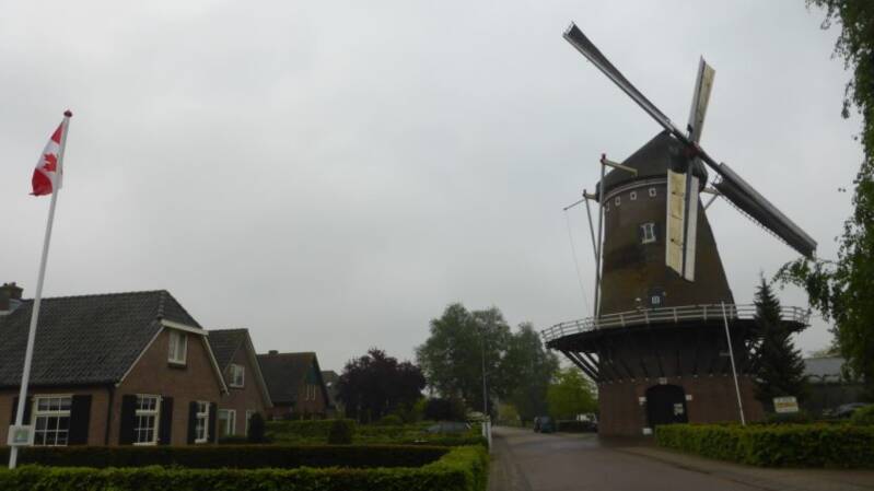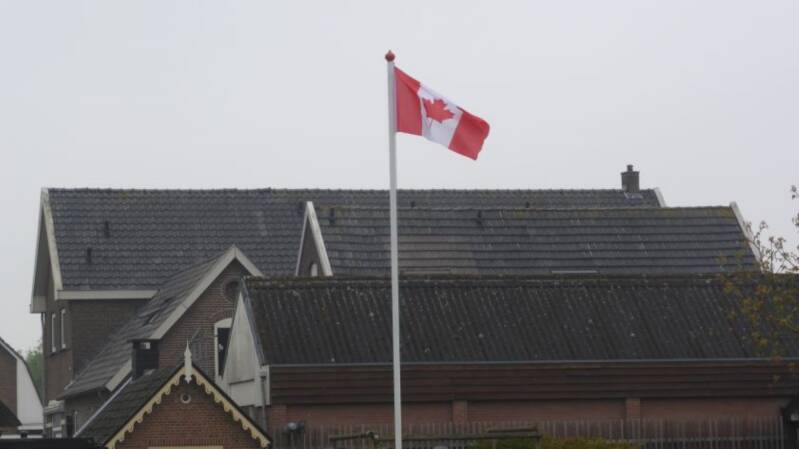 Eerbetoon aan de Canadese bevrijders in Posterenk, waar de Canadese vlag met de Maple Leaf wappert.