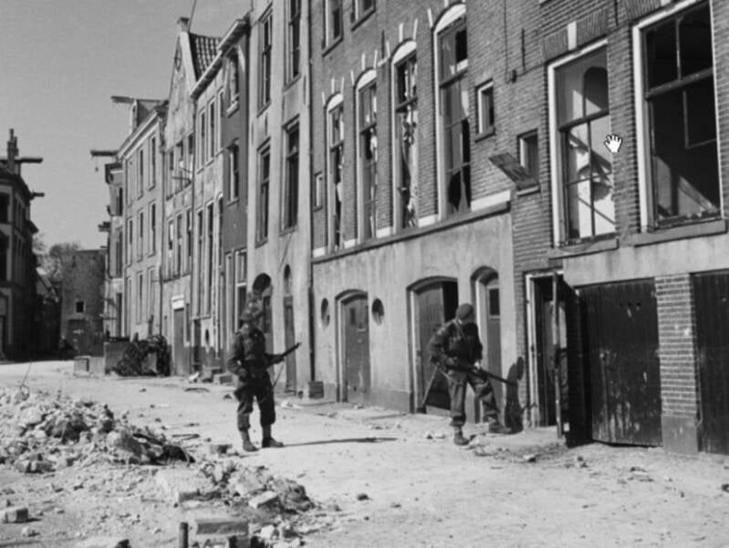 Canadezen inspecteren - deur voor deur - de panden aan de Welle op zoek naar achtergebleven Duitsers.