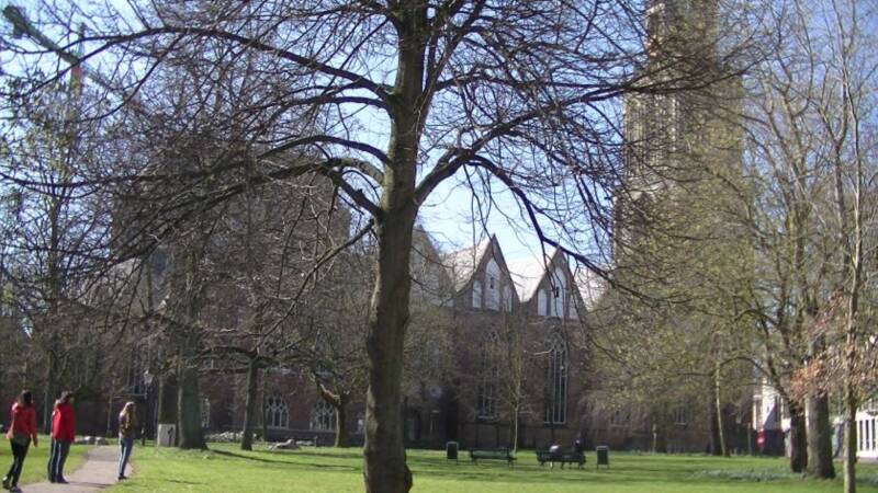 Het Martinikerkhof. Waar nu wandelaars onbezorgd in het park vertoeven, openden de Duitsers het vuur op de Les Fuseliers Mont Royal, die op dat moment de Grote Markt zuiverden op maandagochtend 16 april 1945. Het Martinikerkhof zat vol Duitsers die zich terug trokken uit de brandende binnenstad.