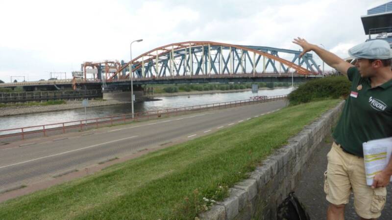 Onze gids Joël Stoppels verhaalt over de gebeurtenissen rond de IJsselbrug bij Zutphen en de bouw van de baileybrug ter vervanging van de vernielde brug.