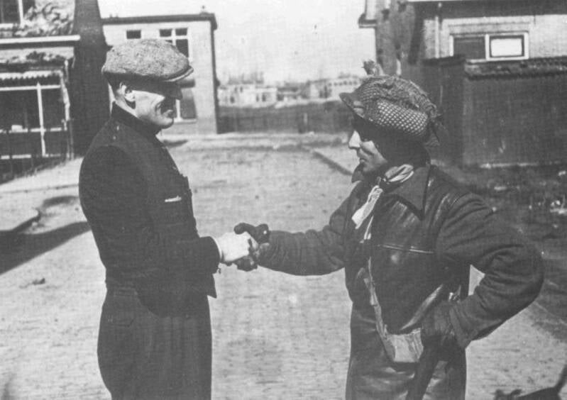 Een inwoner van Zutphen begroet dankbaar zijn Canadese bevrijder.