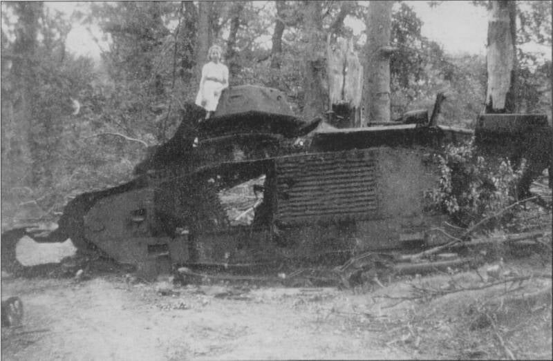 De door de Britse 17 ponder uitgeschakelde Char B tank aan de Sonnenberglaan. Gelet op het meisje dat poseert op de tank, is de foto genomen na de oorlog, toen het gelukkig weer vrede was.