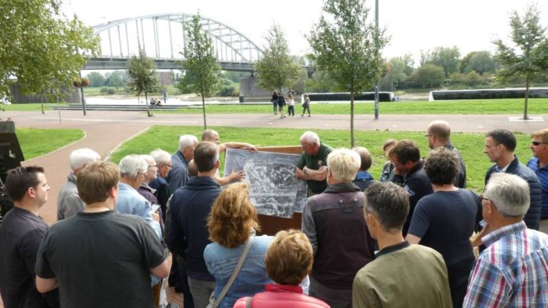 Onze gids vertelt over de gevechten rond de brug terwijl we hier staan in het bij de brug gelegen Jacobus Groenewoudplantsoen.