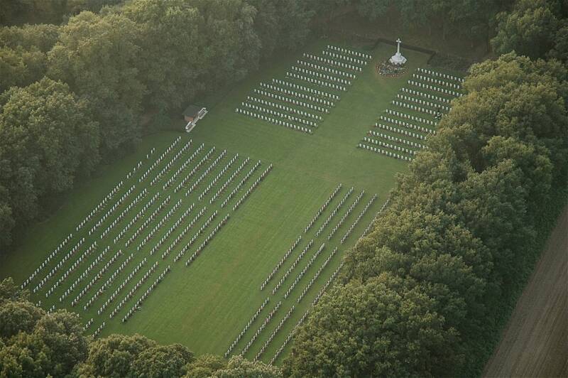 Imposante luchtopname van de Airborne begraafplaats in Oosterbeek.