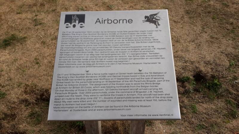 De landingen op de Ginkelse Heide. De mensen die het meegemaakt hebben zien het nu nòg voor zich. De niet aflatende stroom vliegtuigen, in september 1944, waaruit honderden en nog eens honderden parachutisten springen om Nederland te komen bevrijden. Rondom de Ginkelse Heide ontstaan overal gevechten met Duitse troepen die zich hardnekkig verzetten. De 1e Britse Luchtlandingsdivisie had de opdracht om de Rijnbrug bij Arnhem te veroveren. Ze landden in september 1944 in drie dagen ten westen van Arnhem. Het droppingterrein voor de tweede dag, 18 september, was de Ginkelse Heide bij Ede. Voor de verdediging van de heide wordt het 7e bataljon The King's Own Scottish Borderers ingezet. Dit bataljon was op 17 september met zweefvliegen ten noorden van Wolfheze geland. Hun stellingen rond de heide werden door verschillende Duitse eenheden, ondersteund door pantservoertuigen, aangevallen.