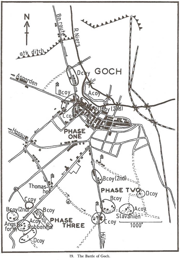 Deze stad was het einddoel van het Britse offensief. De aanval werd ingezet door de 5 Black Watch. In het centrum werden we gewezen op de kelderluiken onder de huizen van waaruit hevig vuur werd afgegeven door de verdedigers. De Duitsers hadden een verdedigingsgordel rond de stad aangelegd om de noordzijde van Goch te verdedigen. In het centrum van Goch gingen we in op de verdediging van de stad en de aanvallen uit alle windstreken om de stad te veroveren. In de nacht van 7 op 8 februari 1945 en een paar dagen later, op 12 februari 1945, werd de stad vanuit de lucht gebombardeerd. Tijdens de slag om het Reichswald, die van 7 tot 22 februari 1945 rond Kleef werd uitgevochten, kreeg de stad haar deel van straatgevechten en artilleriebeschietingen. Bijna tachtig procent van de bebouwing werd in deze korte periode vernield. Het geallieerde opperbevel meende dat er zich rond de stad een gordel van bunkers bevond. Dit kan mee de beslissing tot de zware bombardementen hebben beïnvloed. Het doel van het daarop volgende grondoffensief was om de Rijn bij Wesel over te steken om zo het Ruhrgebied binnen te dringen.