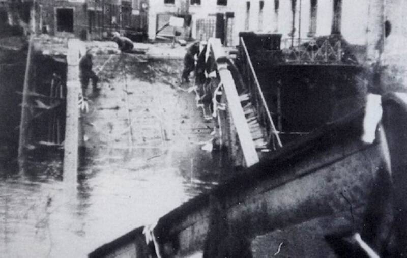 De door de Duitsers opgeblazen Niersbrug wordt verwijderd door de Britse genie