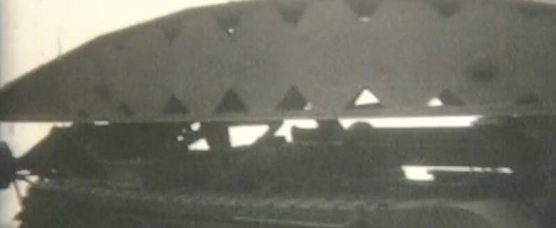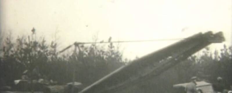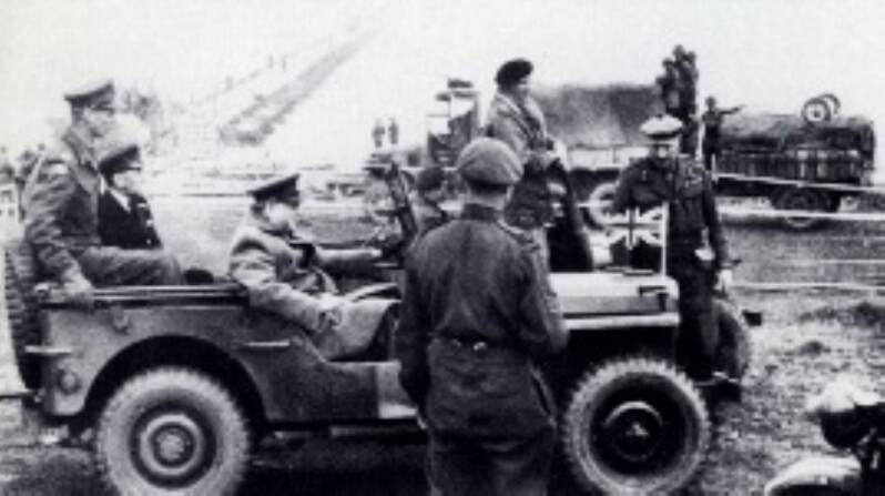 Een jeep met daarin de Britse premier Winston Churchill rijdt over de Bailey brug tussen Oeffelt and Gennep over de Niers. Ook generaal Montgomery is te zien.