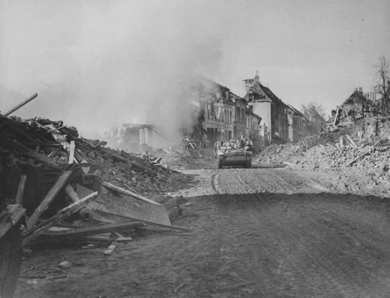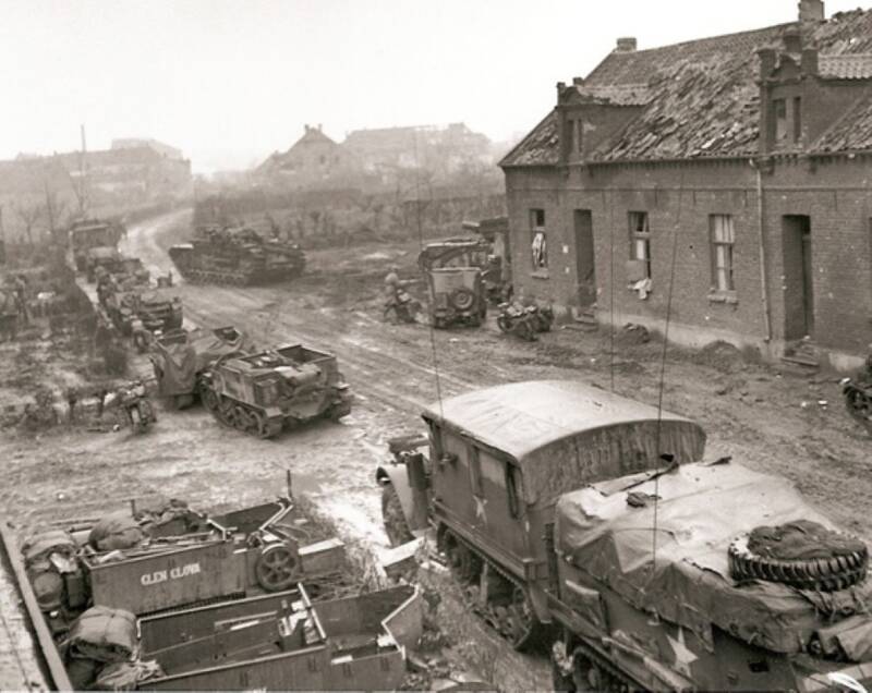 British Bren Gun Carrier rijdt door het zwaargehavende Goch.