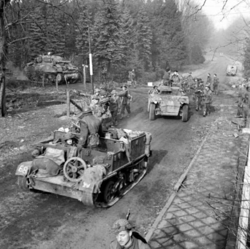 Een Bren Carrier en een Humber scout car met infanterie van de 43rd (Wessex) Division tijdens de aanval op Goch, 17 Februari 1945