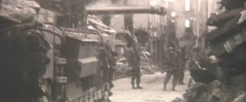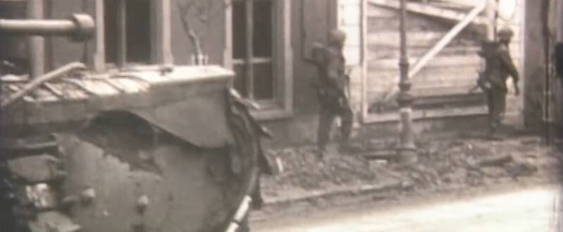 Sherman Firefly tanks rijden door de ruïnes van Kleef op weg om de aanval op Goch te ondersteunen,16 Februari 1945.