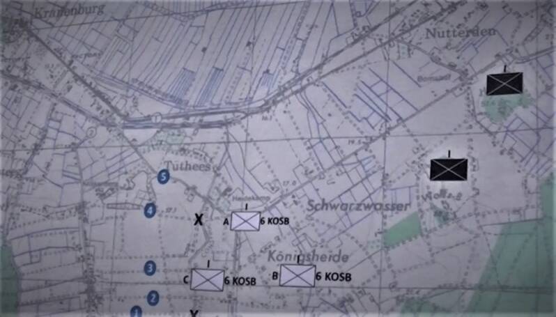 Ons eerste bespreekpunt was op het punt waar we zicht hadden op het dorp Nütterden, waar zich de uitloper van de Siegfriedlinie bevond. Er waren twee bunkers, prikkeldraadversperringen en loopgraven. De 15th Scottish Division van de King Own's Scottish Borderers (KOSB), niet te verwarren met die bij Arnhem hebben gevochten, had de taak gekregen hier de Siegfriedlinie te doorbreken. Zij waren hiervoor uitgekozen omdat ze sinds de invasie in Normandië ervaring hadden opgedaan in het naar voren brengen van infanterie in gepantserde personeelsvoertuigen. Een nieuw fenomeen destijds dat geïntroduceerd was door de Canadezen. Het waren Shermantanks waar de koepel vanaf was gehaald en waarin de infanteristen konden worden vervoerd. Ze hoefden dan niet voor de tanks uit of achter de tanks aan te lopen of op de tanks vervoerd te worden om snel naar de linies te gaan. Dit maakte hen erg kwetsbaar en er was inmiddels een tekort aan manschappen ontstaan vanwege de lange aanvoerlijnen. Dus dit leek de oplossing, die heden ten dage nog wordt toegepast in het leger.