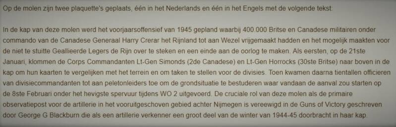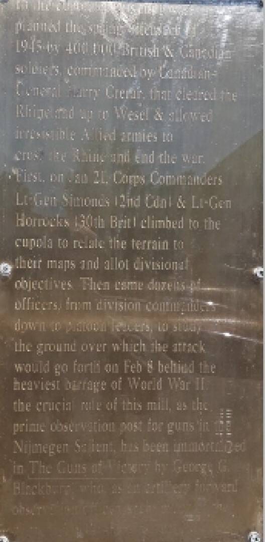 Onze battlefield tour begon bij deze molen in Groesbeek. In de kap van deze molen werd het voorjaarsoffensief van 1945 gepland waarbij 400.000 Britse en Canadese militairen onder commando van de Canadese Generaal Harry Crerar het Rijnland tot aan Wezel vrijgemaakt hadden en het mogelijk maakten voor de niet te stuitte Geallieerde Legers de Rijn over te steken en een einde aan de oorlog te maken. Als eersten, op de 21ste Januari, klommen de Corps Commandanten Lt-Gen Simonds (2de Canadese) en Lt-Gen Horrocks (30ste Britse) naar boven in de kap om hun kaarten te vergelijken met het terrein en om taken te stellen voor de divisies. Toen kwamen daarna tientallen officieren van divisiecommandanten tot aan peletonleiders toe om de grondsituatie te bestuderen waar vandaan de aanval zou starten op de 8ste Februari onder het hevigste spervuur tijdens WO 2 uitgevoerd. De cruciale rol van deze molen als de primaire observatiepost voor de artillerie in het vooruitgeschoven gebied achter Nijmegen is vereewigd in de Guns of Victory geschreven door George G Blackburn die als een artillerie verkenner een groot deel van de winter van 1944-45 doorbracht in haar kap.
