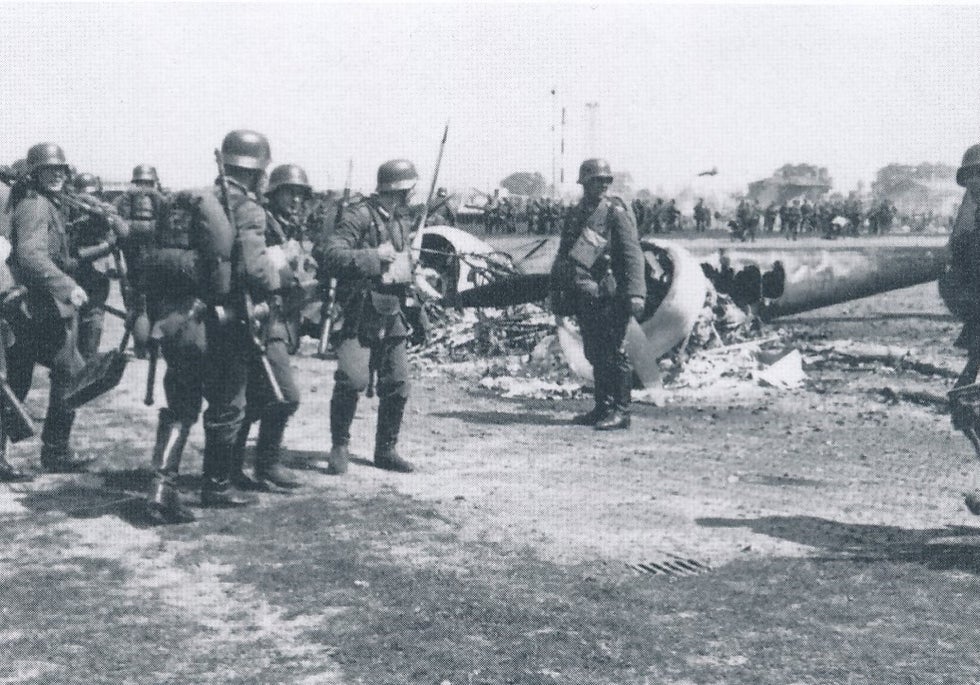 Duitse luchtlandingstroepen passeren op vliegveld Waalhaven een nog in tact zijnde Nederlandse Fokker G-1, voorzien van nummer 319.