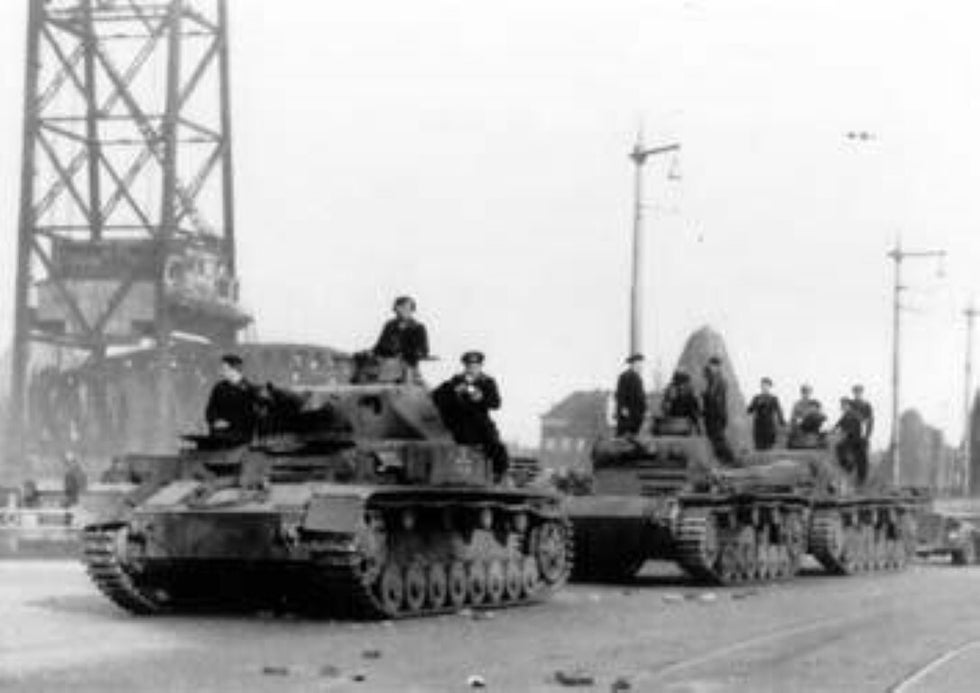 Duitse tanks trekken Rotterdam binnen via de Oude Binnenweg.