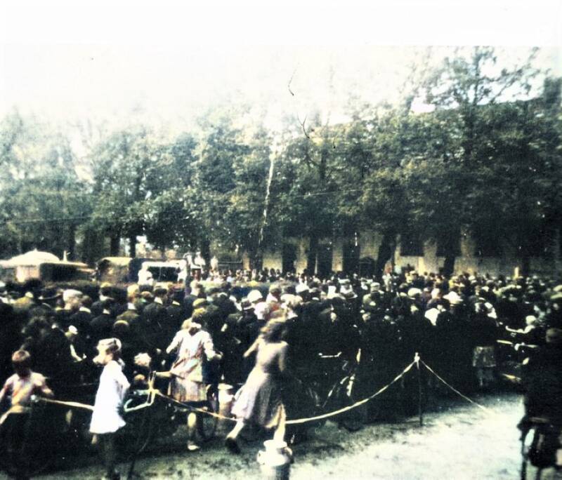 Het pand waarin het distributiekantoor was gevestigd, ziet er nog net zo uit als in de oorlog. Tegen de aanhanger rechts staat een wit luik, dat werd opengeschoven als de bali voor het publiek werd geopend.