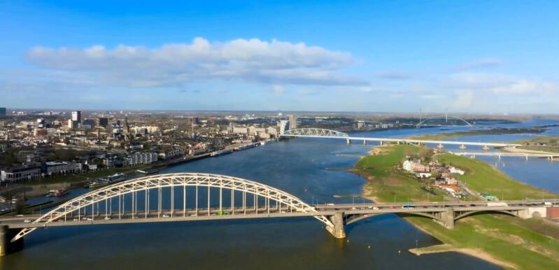 De Waalbrug bij Nijmegen. Verderop de spoorbrug en de brug De Oversteek. De weg over de brug draagt sinds 2016 de naam Generaal James Gavinsingel. De oeververbinding is in november 2013 geopend en ligt ten westen van de twee bestaande Nijmeegse bruggen.