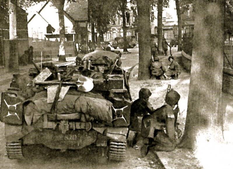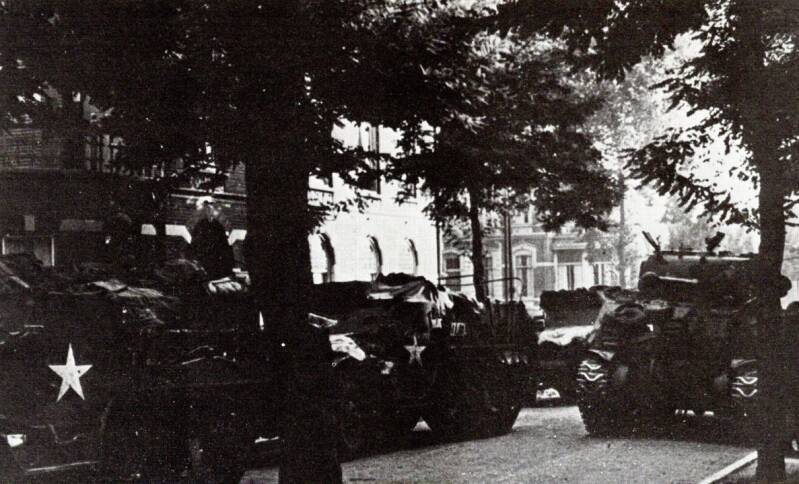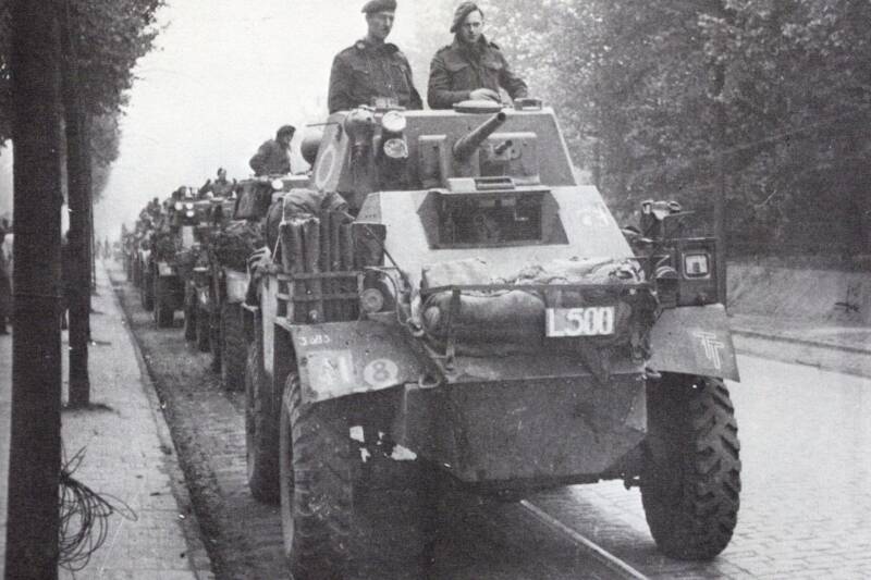 Daar de Duitsers in Noord-Brabant tot tweemaal toe de Britse opmarsroute ('Hells Highway') afsneden, kon de 50ste Infanterie Divisie Northhumbrain pas in de tweede week van de operatie Nijmegen bereiken, te laat om invloed op de gang van zaken bij Arnhem uit te oefenen. Pantserwagens van het divisieverkenningsregiment trekken - de tramlijn volgend - via de Sint Annastraat naar het centrum van Nijmegen, hoek Reestraat. De letters TT op de spatborden staan voor 'Tyne and Tees', het divisie-embleem.