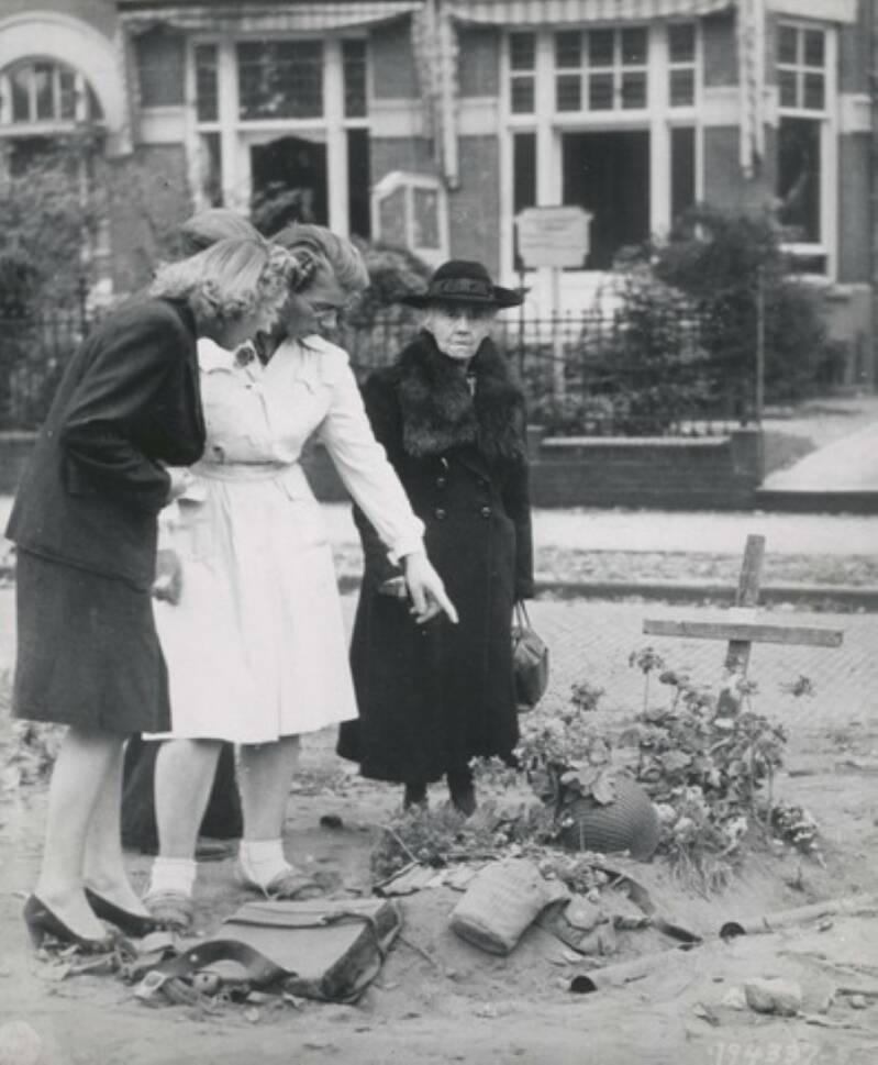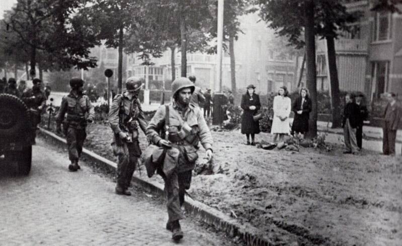 Amerikaanse soldaten van de 82nd Airborne Division lopen over de Oranjesingel in Nijmegen. Op de achtergrond is het veldgraf van Pvt Harold E. Peterman, 1st Platoon, F Company, 505th PIR, 82nd Airborne Division te zien, met daarbij ondermeer de vrouw gekleed met een witte jas, die ook op de detailfoto van het graf hieronder is te zien.