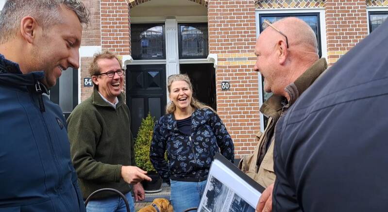 Deze bewoners aan de overkant tonen belangstelling wat zich bij hen aan de overkant heeft afgespeeld. Onze gids toont hen de foto met de gewonde soldaat in de jeep.