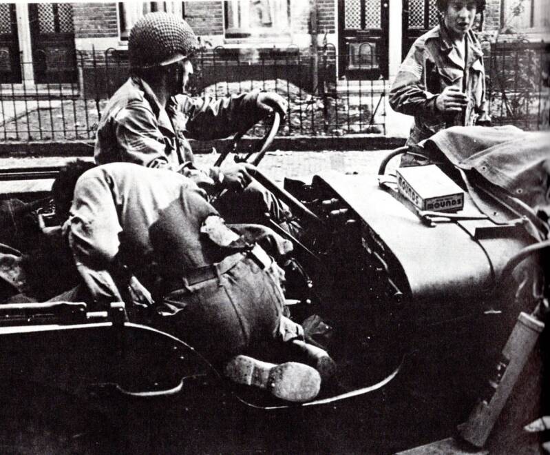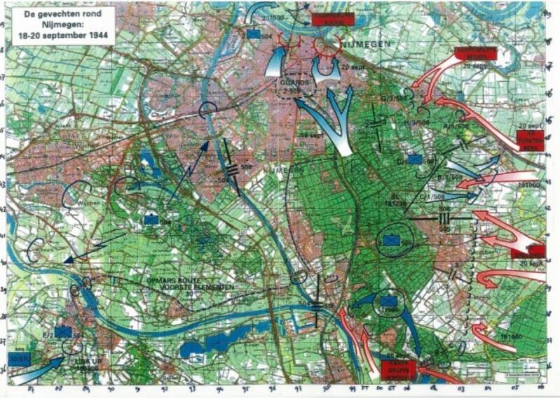 Dinsdag 19 september 1944, laat in de middag. De bemanning van een gepantserde Daimler verkenningwagen, behorende tot de Welsh Guards, vraagt op de Groesbeekseweg in Nijmegen, ter hoogte van huisnummer 230, de weg naar de Waalbrug aan enige Amerikaanse para's, bij toeval de staf van het 505 Regiment. De man met de stafkaart is luitenant-kolonel Ben Vandervoort. Tweede van rechts is de regientscommandant kolonel Bill Ekman. Op de achtergrond een Sherman tank ('firefly') van de Grenadier Guards.