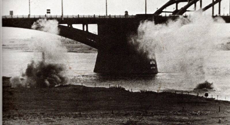 Naast alle verwoede pogingen die de Duitsers in het werk stelden om de Waalbrug bij Nijmegen alsnogte vernielen, hinderden zij het geallieerde verkeer daarover voortdurend met storingsvuur. Deze bijzondere opnme - genomen vnaf hotel Lent - toont de inslag van twee vijanderlijke artilleriegranaten, zogenoemde 'near misses".