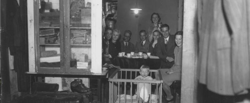Een gezin in hun schuilplaats in de winter van 1944 te Nijmegen. De lachende gezichten kunnen zijn omdat men allang blij is niet meer onder het Duitse juk te moeten leven. Of het is dat klein kind in de box, dat het gezelschap nog enigszins opvrolijkt.