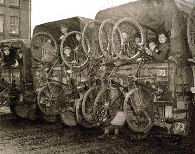 20 november 1944: een volgeladen truck met vluchtelingen en fietsen, geëvacueerd vanuit het zuiden van Arnhem, arriveert in Nijmegen.