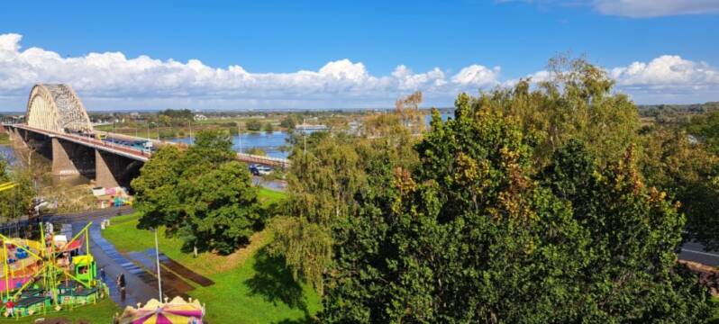 Nadat we de Valkhof doorgelopen waren en de tour beëindigd was liepen we alsnog naar het plateau vanwaar we uitzicht hadden op de Waalbrug.