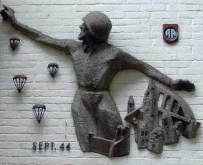 Het beeld van de paratrooper op de gevel van het hotel herinnert nog aan deze hectische dagen in september 1944.
