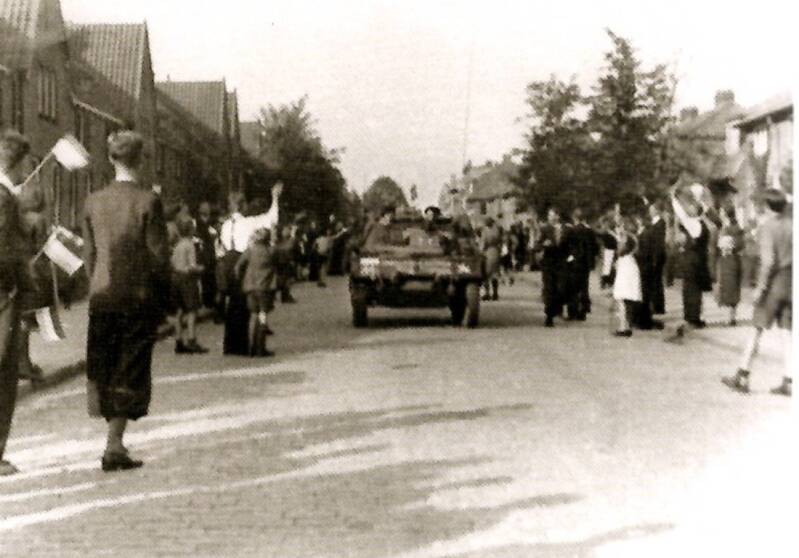 Brencarriers - in het spoor van de verkenningswagens - met montere, warm geklede Britten, rammelen over de Sint-Annastraat, hoek Reestraat.