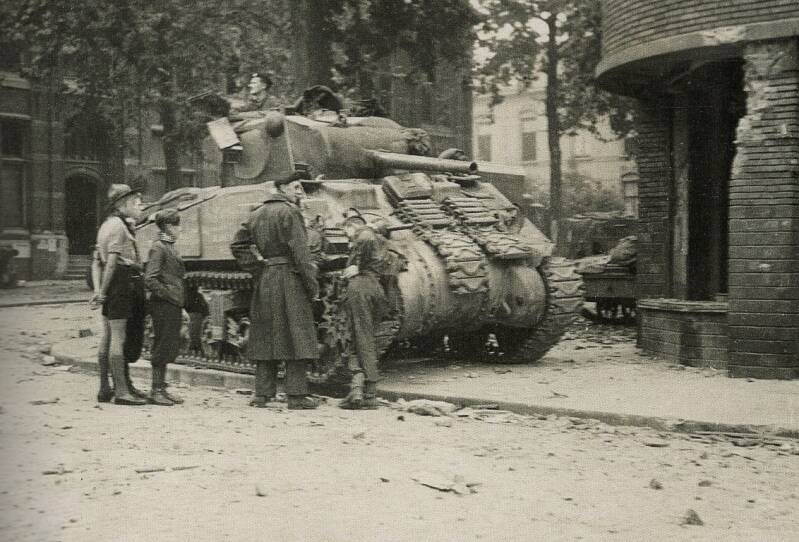Nijmegen 20 september 1944. Een Britse tank staat aan het ein van de strijd op de hoek van de Hertogstraat en het Kelfkensbos. Bij het slotoffensief vielen Britten vanuit het westen, van achter de huizen op de achtergrond, het Valkhofpark aan. De aanvallen vanuit de Hertogstraat werden steeds bemoeilijkt door de felle Duitse weerstand en de branden in de omgeving.