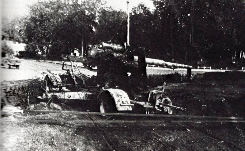 Het geduchte Duitse 88 mm kanon op het toenmalige Nijmeegse Keizer Lodewijkplein, dat zoveel moeilijkheden had veroorzaakt, werd tenslotte toch uitgeschakeld en later door een buldozer aan de kant geschoven. Het stuk wijst met zijn verstomde loop naar het doel van aller inspanning: de verkeersbrug. Op de achtergrond het Hunerpark (met een zogenaamd 'Peeman'-kiosk), een fel omstreden gebied!