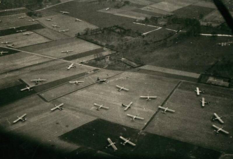 Parachutes vullen de lucht op 24 maart 1945, op deze foto genomen tijdens Operatie Varsity door de beroemde Life magazine gevechtsfotograaf Robert Capa, die sprong met de 507th Parachute Infantry Regiment, 17th Airborne Division.